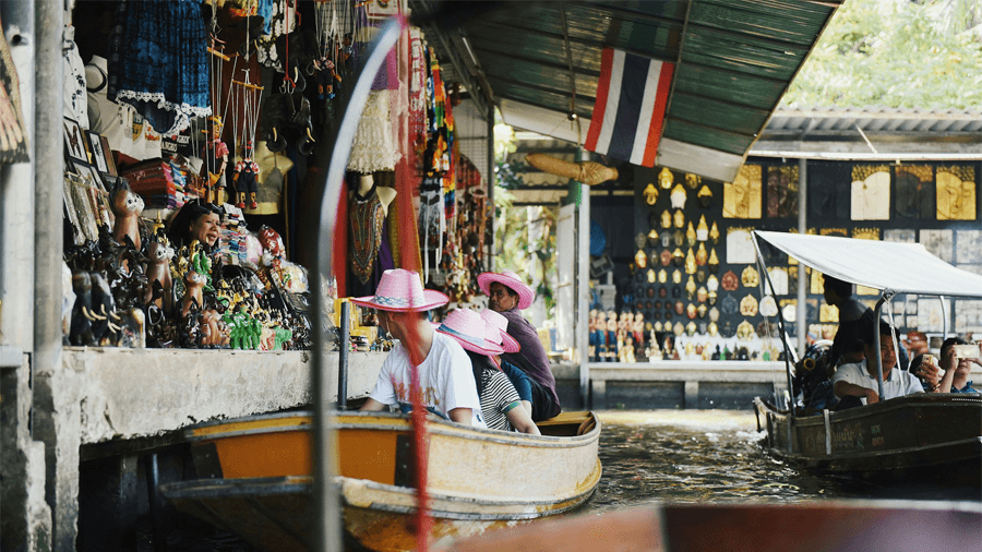 Flytande marknader är en av de mest ikoniska kulturella upplevelser i Thailand. En av de mest kända är Damnoen Saduak, som ligger cirka två timmar från Bangkok.