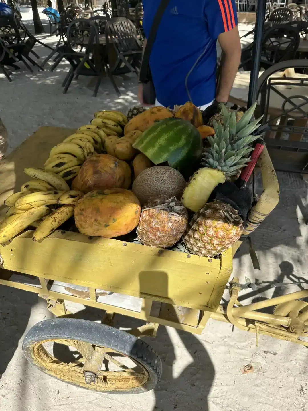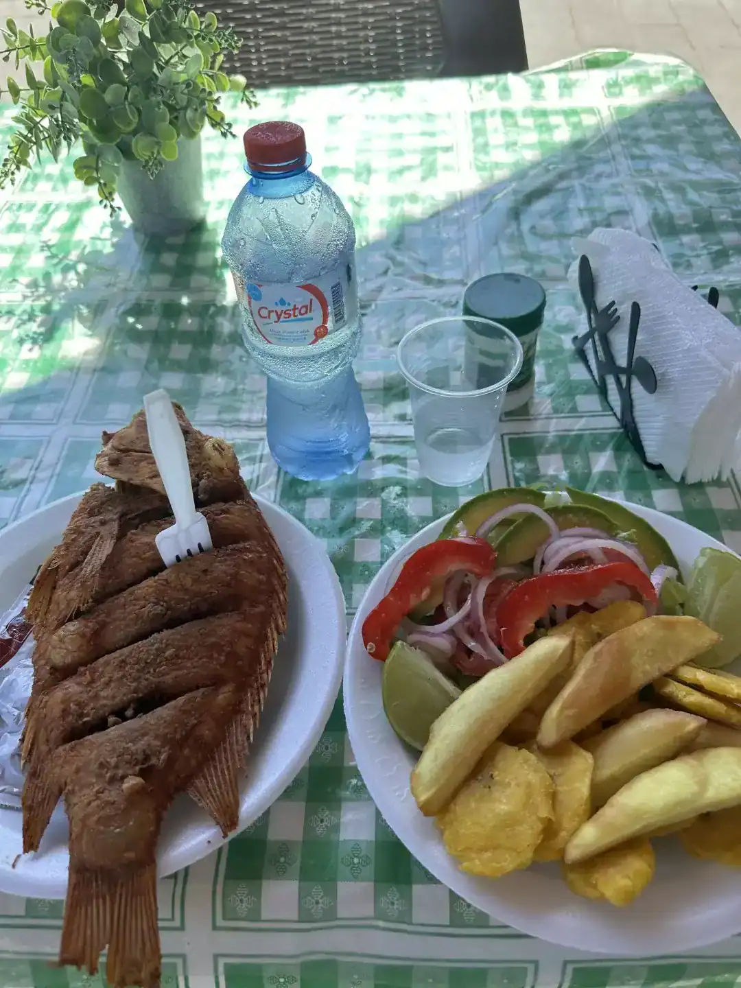 50 meter bort finns ett gäng små utekök utanför de turistiska strandrestaurangerna med väldigt enkla förhållanden. Han känner en dam som driver ett av ”hålen” i väggen som serverar den dominikanska paradrätten friterad fisk. Jag får specialpris och resten är en kulinarisk upplevelse bortom tid och rum.